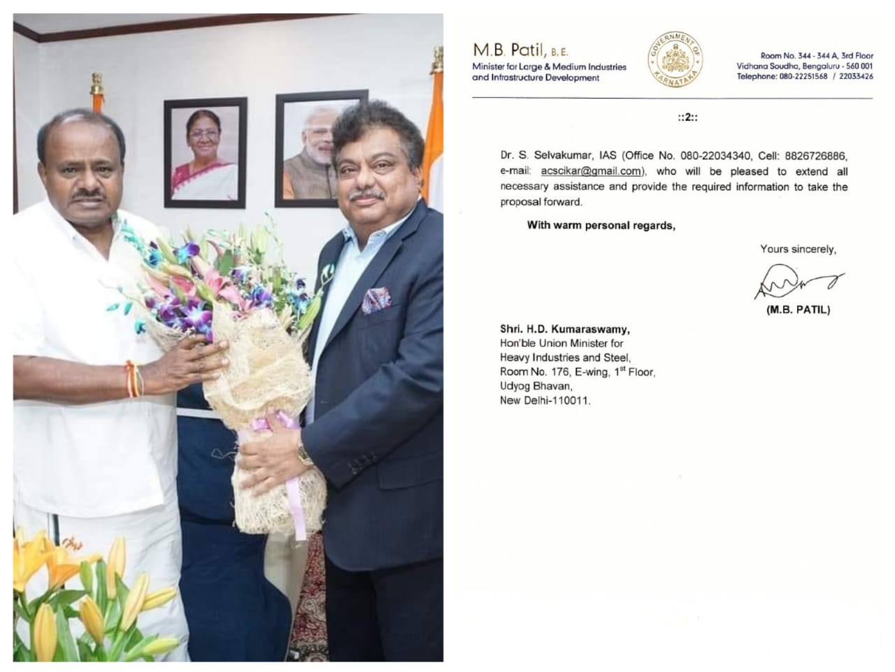 ಕೇಂದ್ರ ಸಚಿವ ಎಚ್ ಡಿ ಕುಮಾರಸ್ವಾಮಿ ಅವರು ಜನವರಿ ಎಂಟರಂದು ಬರೆದಿದ್ದ ಪತ್ರಕ್ಕೆ ಕೈಗಾರಿಕೆ ಸಚಿವ ಎಂಬಿ ಪಾಟೀಲ್ ಸೋಮವಾರ ಉತ್ತರ ನೀಡಿದ್ದಾರೆ